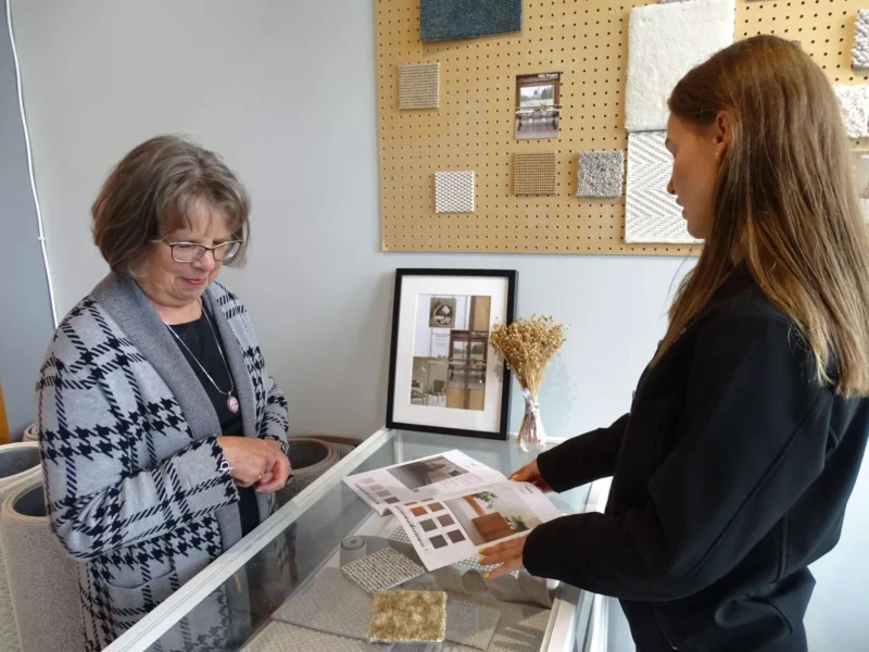 Laila ja hänen miehensä kävivät katsomassa VM Carpetin mattoja Vantaan Tammiston myymälässä ennen ostopäätöstä.